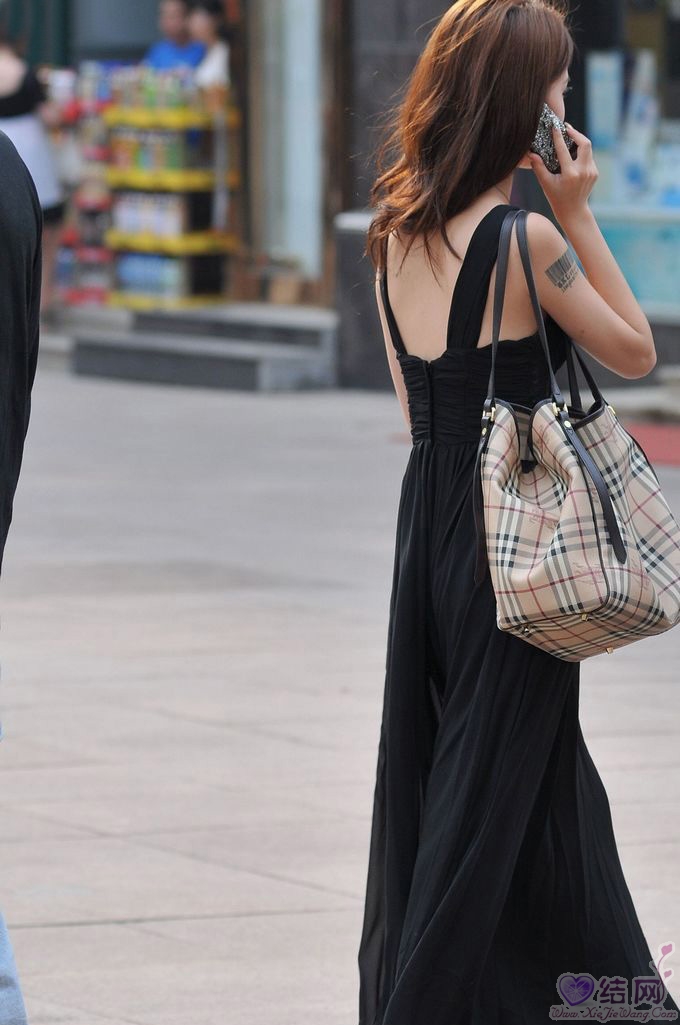 街拍黑色低胸长裙时尚美女