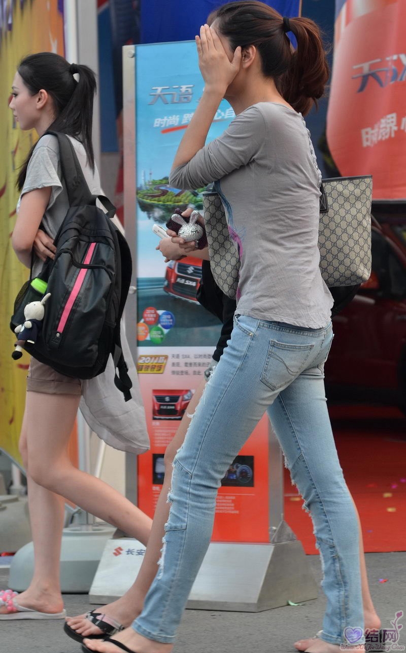 车展外的破牛仔裤美女腿模