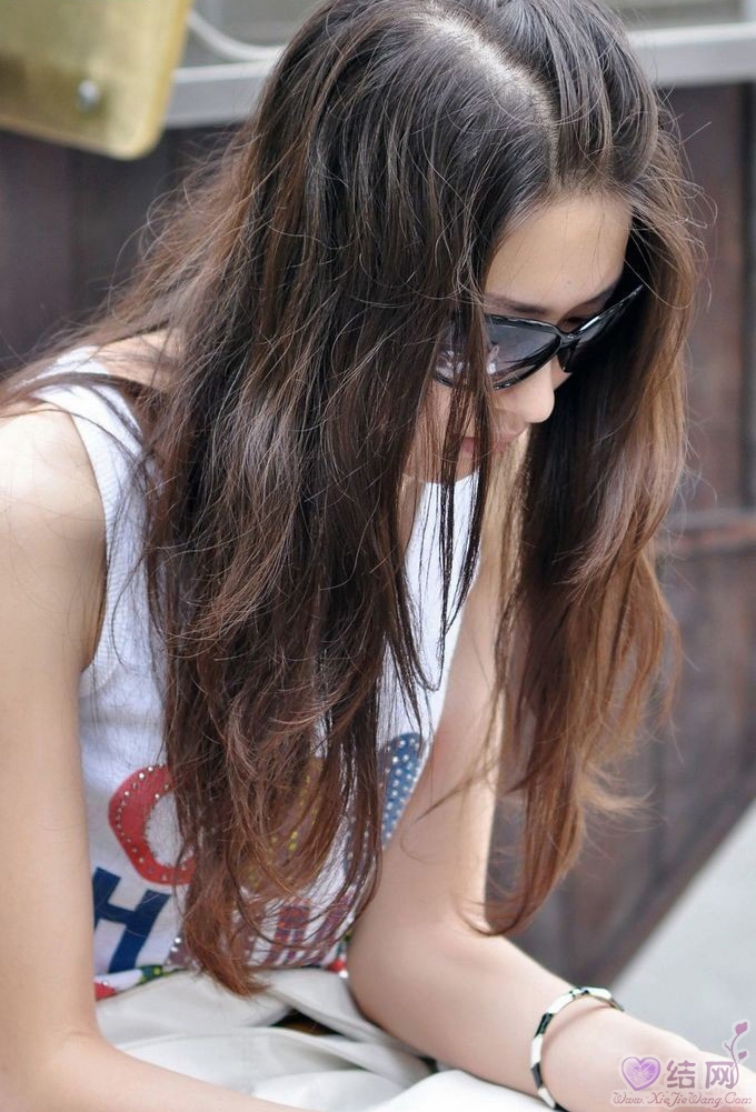 抓拍到公园里戴着墨镜的牛仔美女