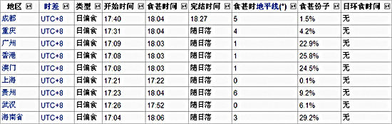 ![]() 2009年1月26日日食路径图 ![]() 2009年1月26日日食我国各主要城市的日食资料 (时间误差为±1分钟) ![]() 2005年4月8日拍摄的照片显示,委内瑞拉一个名为安第斯的村庄上空出现日环食。这是一次极为罕见的混合型日食,日全食仅能在巴拿马、哥伦比亚和委内瑞拉一个狭长型的地带看见。 据广东天文学会预告:中国农历牛年春节初一(一月二十六日),部分地区将出现奇妙天象——日环食。这次日环食,环食带将经过印度洋和印度尼西亚,在印度尼西亚首都雅加达的西北面地区,可目睹到日环食的全过程。在中国南方地区可看到日偏食。 今年是国际天文年,又是人类首次采用天文望远镜观察宇宙星空四百周年。今年,全国天文奥林匹克竞赛首次在广东实验中学举行,广东天文学会将首次在国际天文年举办天文摄影大赛。天文爱好者可不失时机地观察和拍摄日食,如果错失这次春节观看日食的良机,就要再等三十八年才可在春节再次看到日偏食。 之所以会发生日环食呢,是因为今年一月二十六日十五时五十五分(朔),太阳、月球和地球排成一条直线而发生日食;又因为当天月球距离地球较远,而太阳距离地球较近,月球的视圆面较小而不能全部遮掩太阳,因而发生日环食。 这次日食,中国南方是在晚霞中观看红日“带食而落”。阳光强烈时,要借助滤光片观看,要注意保护眼睛。天文爱好者可用相机长焦镜头拍摄日偏食。 这次日食,各地的观测数据如下:在广州,初亏是十七时零九分;食甚是十八时零三分,食分是零点三四九;日落是十八时十分。在香港,初亏是十七时零八分,食甚是十八时零三分,食分是零点三八一;日落是十八时零八分。在澳门,初亏是十七时零八分,食甚是十八时零三分,食分是零点三七七;日落是十八时十一分。 据预测,广州下一次在春节观看日偏食出现在二O四七年,日期恰好也是一月二十六日(朔)。(郭军 李建基) |