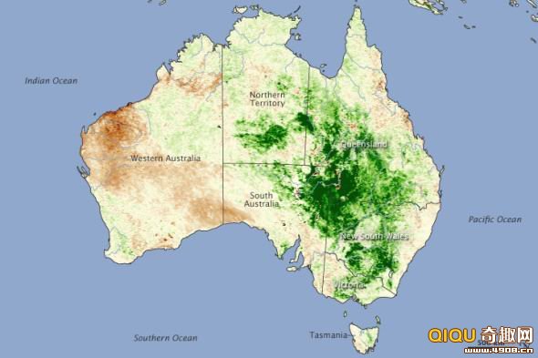 ![]() 卫星图像揭示澳洲中部植被异常茂密景象 据美国宇航局官网报道,对于澳大利亚中部地区来说,2010年的夏秋之交是一个多事之秋,先是暴雨连连,接着暴雨导致洪灾、虫灾等连锁反应。极端的暴雨不仅仅带来洪水灾害,还同时将干旱、贫瘠的沙漠变成一片绿色。2010年4月,美国宇航局根据“NOAA-18”卫星3月份的观测数据绘制了一幅澳大利亚植被指标图,图片显示了澳大利亚干旱地区植被茂密的极端异常景象,茂密的植被为蝗虫的滋生提供了理想的环境。 在2月底到3月初,澳大利亚干旱的内陆地区也出现罕见的暴雨。在澳大利亚中部部分地区,11天的降雨量比平常年份一年的总降雨量都要多。澳大利亚气象局介绍说,局部地区的降雨总量甚至超过2009年全年降雨总量的2倍。 在这幅植被指标图中,绿色区域代表植被密度要高于2006年到2009年的平均密度,而棕色区域代表的是植被密度要低于2006年到2009年的平均密度。在南澳大利亚州、昆士兰州和新南威尔士州三州交界处,绿色色调显得特别深,这表明该地区的植被在3月份呈爆发性生长趋势。绿色植被给蝗虫提供了理想的栖息地。据澳大利亚治蝗委员会介绍,到3月底,在新南威尔士州、南澳大利亚州北部以及昆士兰州西南部等地,已滋生了大批蝗虫幼虫。 澳大利亚治蝗委员会在3月间对虫灾区域进行了严密的监测,并绘制了3月份蝗虫分布图。监测结果显示,蝗虫泛滥的区域也就是植被异常茂盛的区域。植被茂盛的地区为蝗虫提供了充足的食物来源和理想的栖息地,这才是造成虫灾爆发的主要原因。澳大利亚治蝗委员会预计,到4月份还将有大群大群的蝗虫滋生。蝗虫的滋生给澳大利亚的农业生产带来了灾难性的后果。据法新社报道,截至4月14日,蝗虫已经破坏了数千公顷的庄稼。 |