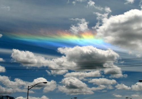 图中这种扁平状的彩虹就是所谓的火彩虹,也被称为“环地平弧”。“环地平弧”是一种极其罕见的光学现象,只有当太阳光线与地平线呈58度角时才会形成的冰晶折射现象。之所以也被火彩虹,是因为它看起来就像彩虹在天空自发的燃烧,划过天空。火彩虹不像普通的彩虹那么容易见到,这主要因为那种条件实在太难满足了,首先太阳要与地平线成58度角,同时你观察的天空要在20000英尺(约6100米)的高度上存在卷云。 |